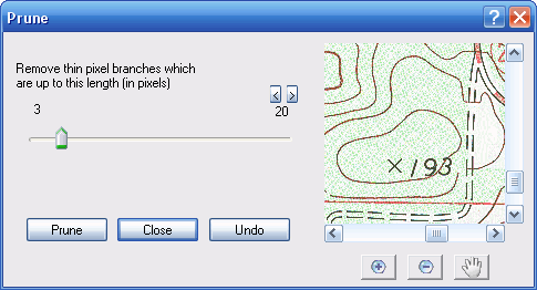 This option scans the raster for incidences of a short line of pixels which connects off another line. The short lines will be deleted. You can use the slider to select the maximum line length which you want deleted.