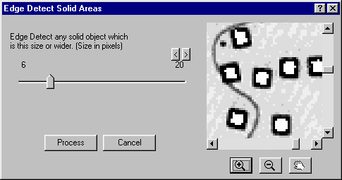 Use the slider to select the size of object to hollow out. Only objects this size or larger will be affected. When you click the Process button WinTopo will search the image for solid features and leave only their edges, filling their centres with light coloured pixels.
