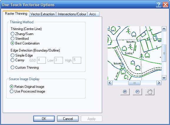 Use Processed Image. With this option the raster image is not copied, but all processing is performed on the original image. Therefore when the One-Touch Vectorisation has completed you will see the thinned raster image, and the original image is discarded.